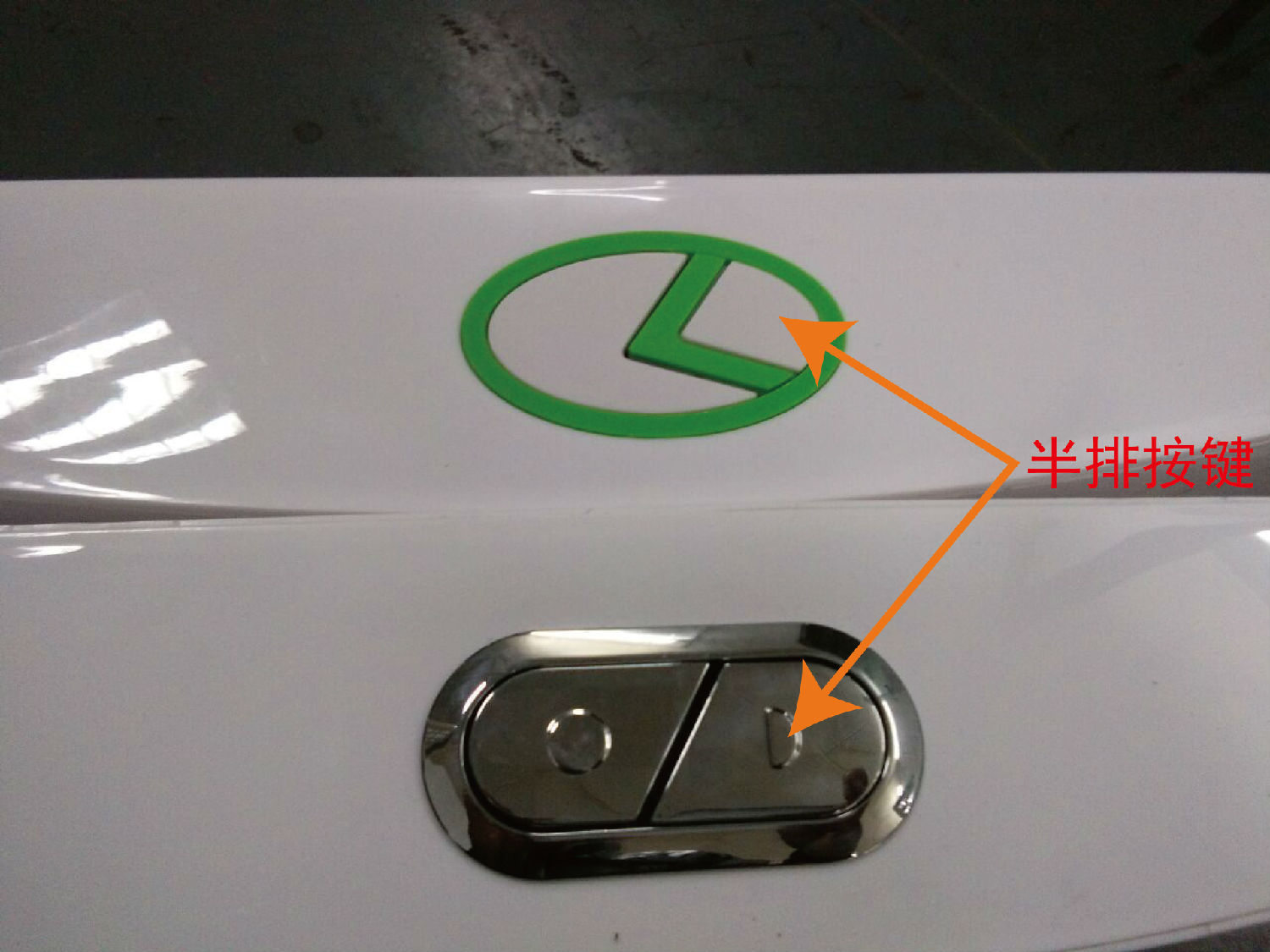 .按鍵小的和按鍵上有小標記的,這個鍵可以調節(jié)用水量多少,可根據自己平時用水的情況,這邊叫半排按鍵,也就是說在使用這個鍵時,蹲便器水箱的水只能排出部分水或一半的水,如圖: